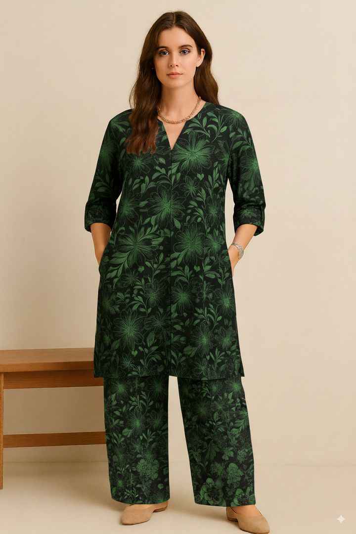 - This Modern minimalist cord set comes with a relaxed fit, V-slit neckline,rolled-up sleeves with tab closure with subtle Center seam and side pockets with a relaxed wide leg trousers.