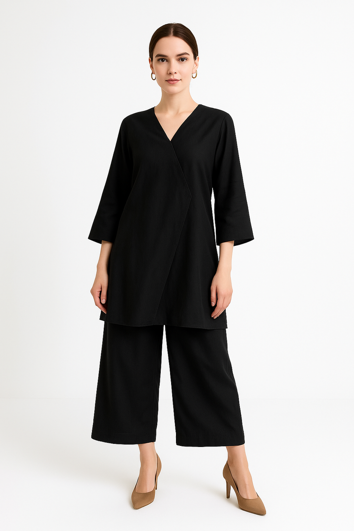 - A V-cut neckline shirt with a tapered front cutline with loose/relaxed fit with a wide leg plazo.