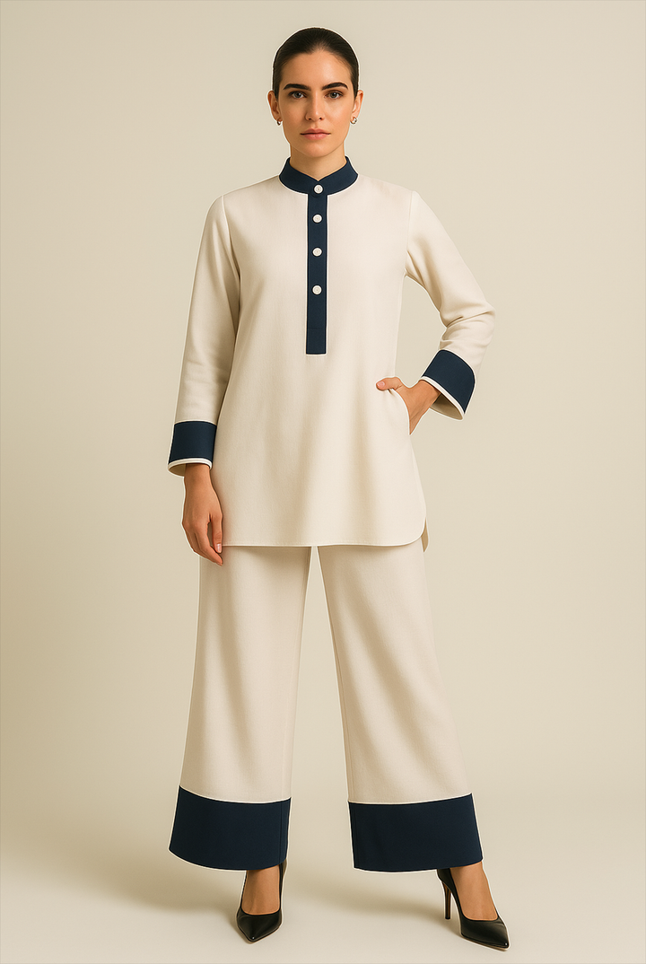 - A contrasting band collar shirt with small placket paired with a loose/relaxed fit wide leg pants with trims on the bottom.