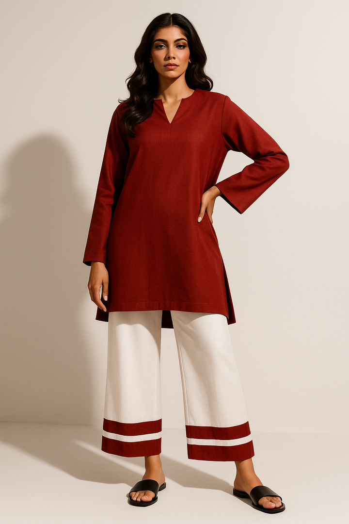 - A V neck shirt paired with loose pants and trims at the bottom.