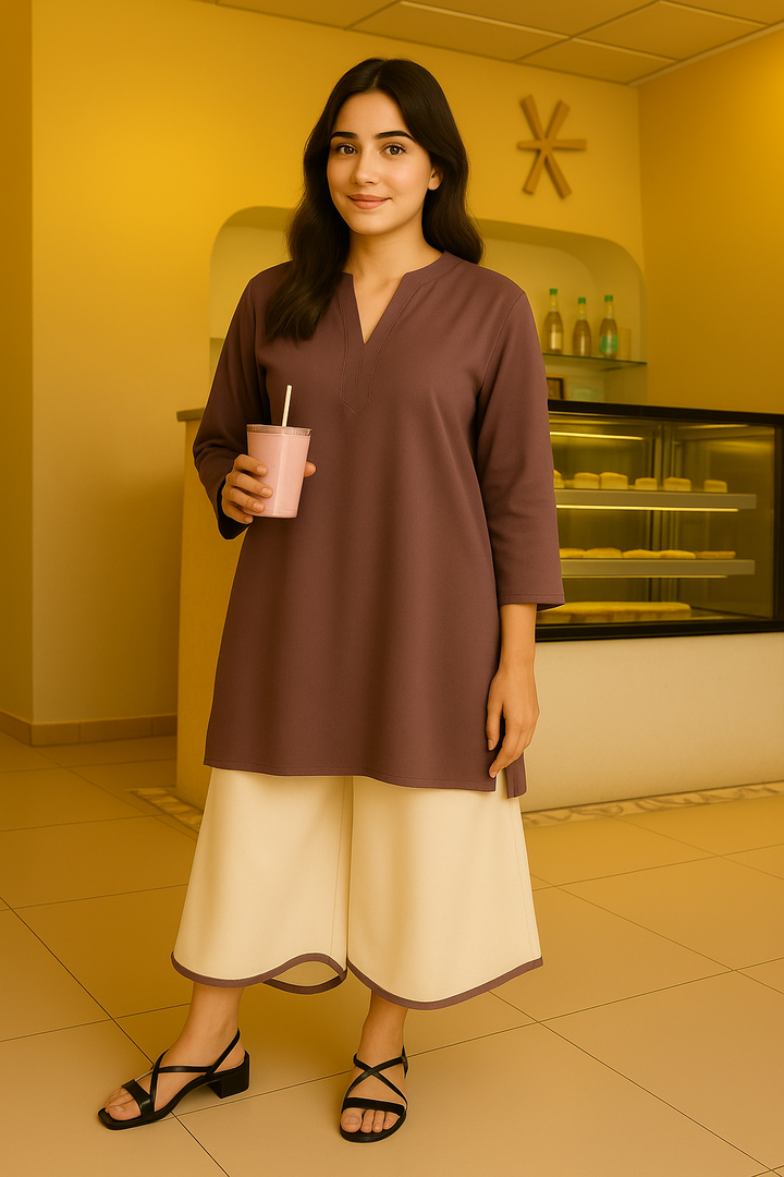 - A simple relaxed V-neck shirt with a white relaxed extra wide leg plazo and dusty mauve piping over it.
