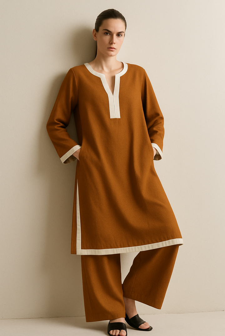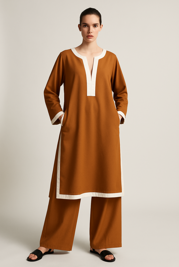 - A round neck V cut shirt with contrasting trim around the neck and hem, paired with a loose/relaxed fit wide leg pants.
