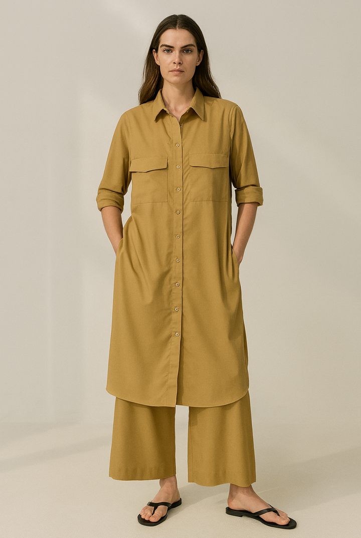 - A long front button-down shirt (kurta style), ankle length paired with loose pants.