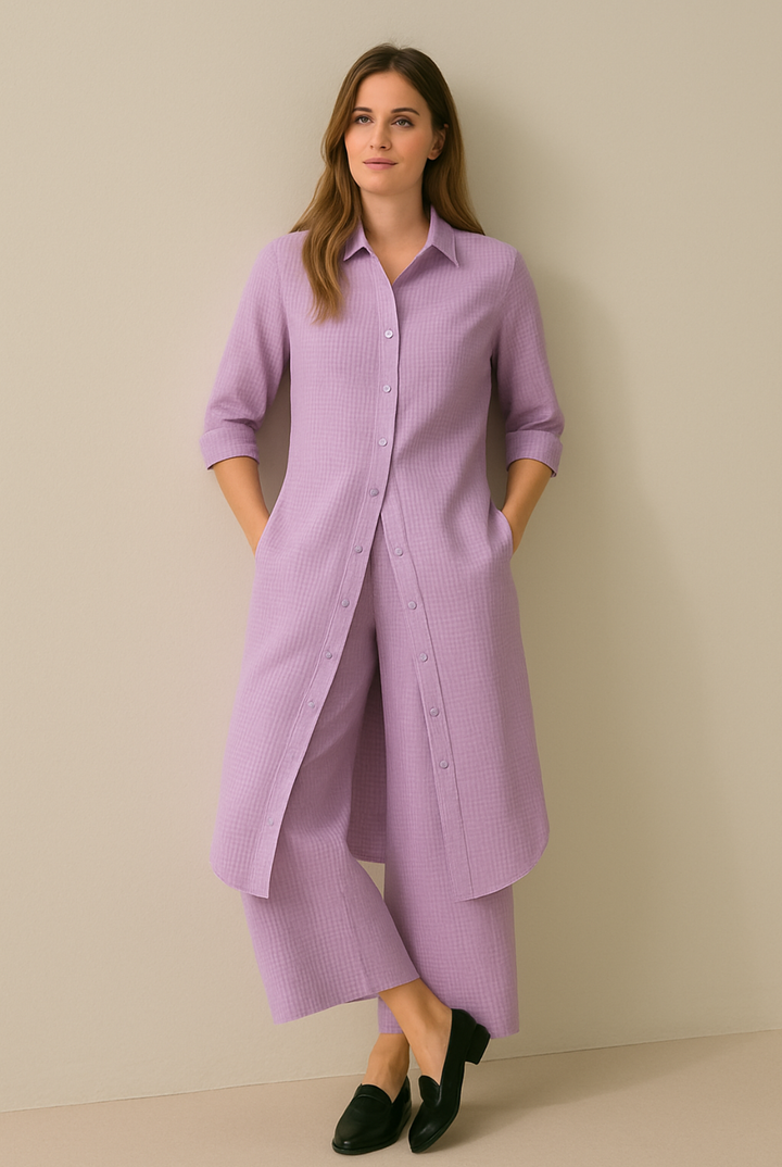 - A long front button-down shirt dress (kurta style), paired with loose pants.