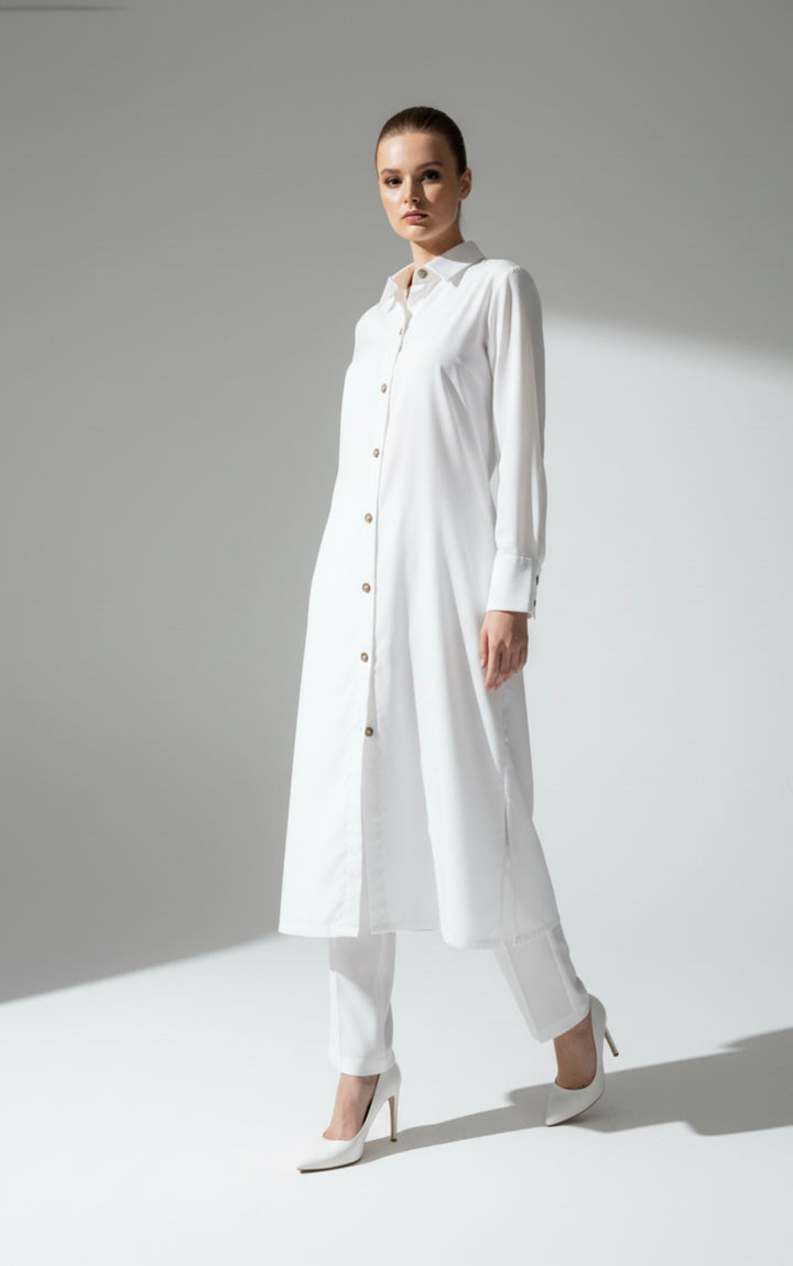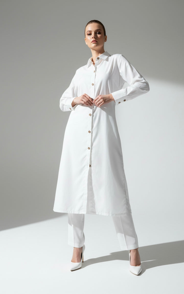 - A long front button-down shirt paired with loose pants.