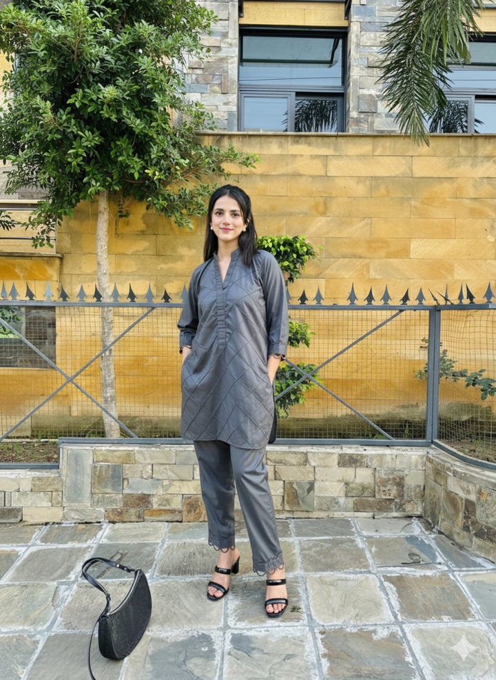 - A band collar V cut shirt with pintex detailing all over shirt and loop detailing on sleeves and bottoms paired with straight pants.