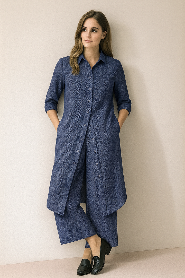 - A long front button-down shirt dress (kurta style), paired with loose pants.