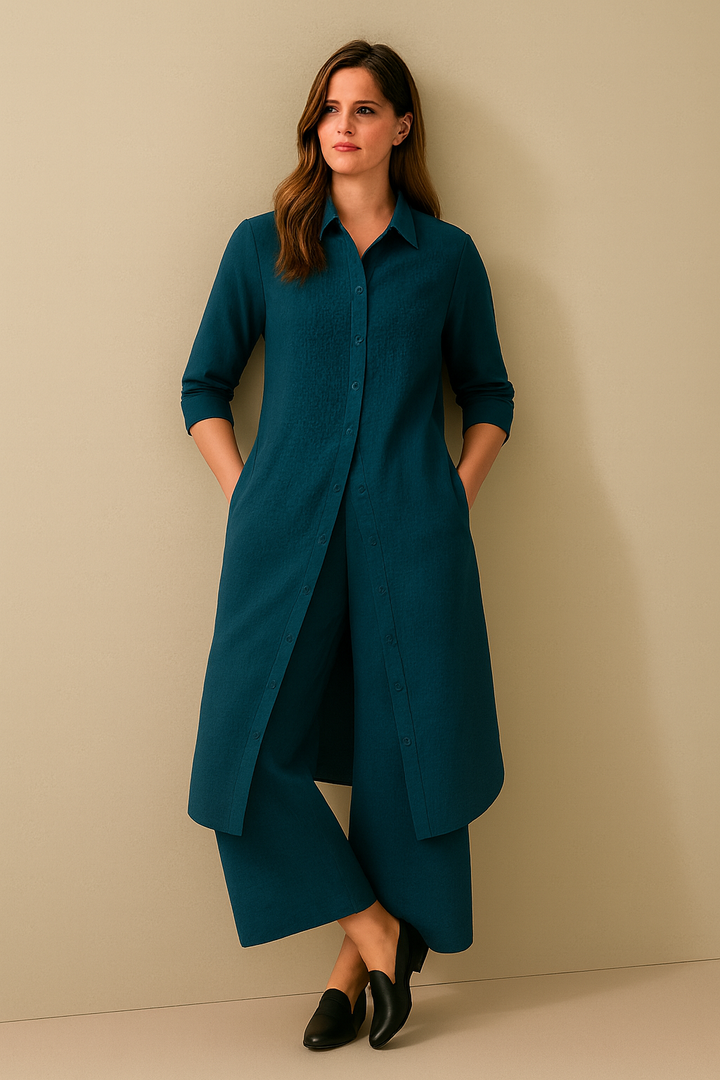 - A long front button-down shirt dress (kurta style), paired with loose pants.
