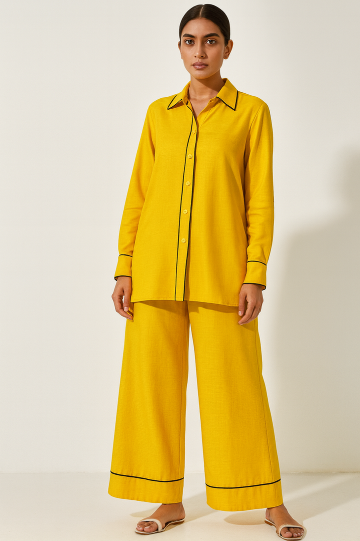 - A loose-fit button down collar shirt with black piping detail on collar, placket and sleeves paired with wide leg trouser.