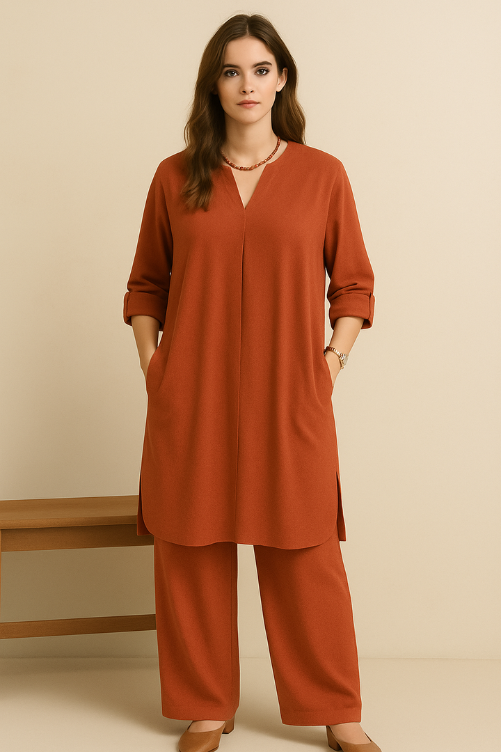 - This Modern minimalist cord set comes with a relaxed fit, V-slit neckline,rolled-up sleeves with tab closure with subtle Center seam and side pockets with a relaxed wide leg trousers.