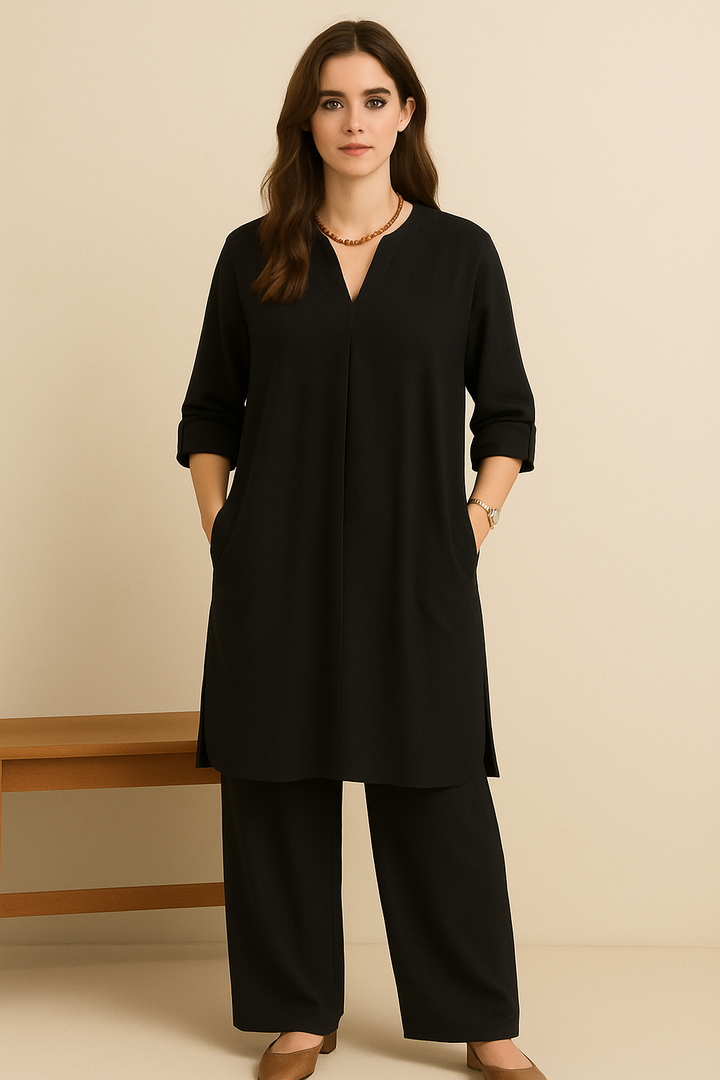 - This Modern minimalist cord set comes with a relaxed fit, V-slit neckline,rolled-up sleeves with tab closure with subtle Center seam and side pockets with a relaxed wide leg trousers.