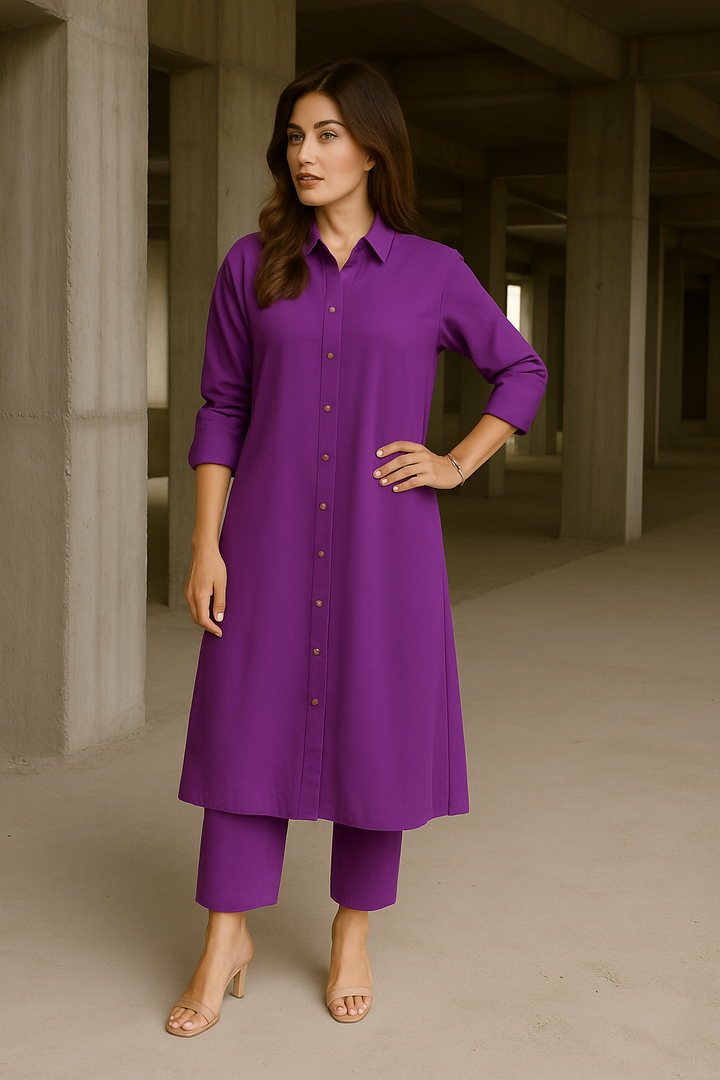 - A long front button-down shirt dress (kurta style), ankle length with wooden buttons and straight pants.