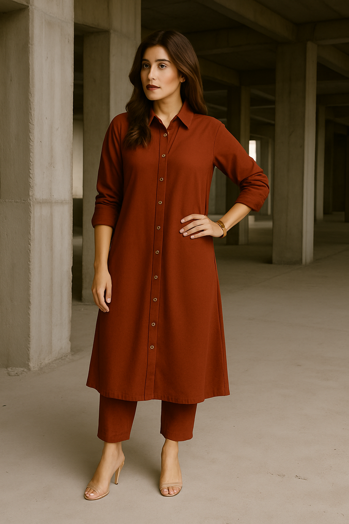 - A long front button-down shirt dress (kurta style), ankle length with wooden buttons and straight pants.