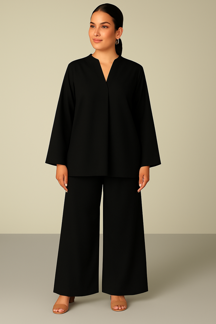 - A band collar with V-cut neckline shirt with a loose/relaxed fit with a wide leg plazo.