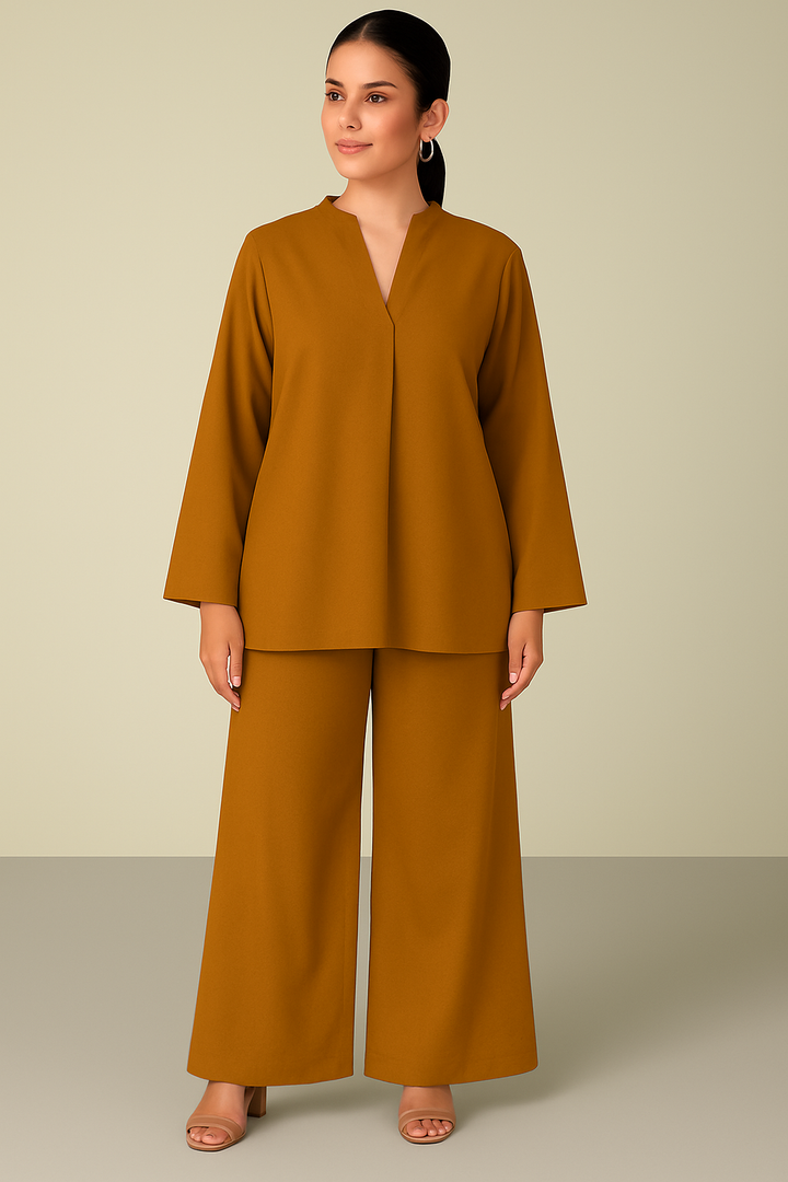 - A band collar with V-cut neckline shirt with a loose/relaxed fit with a wide leg plazo.