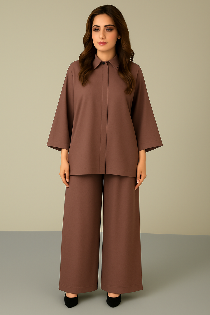- A loose-fit, mid-thigh length shirt with a hidden button placket, wide sleeves, and a wide leg trouser.