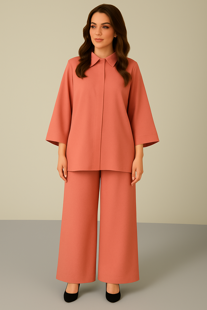 - A loose-fit, mid-thigh length shirt with a hidden button placket, wide sleeves, and a wide leg trouser.