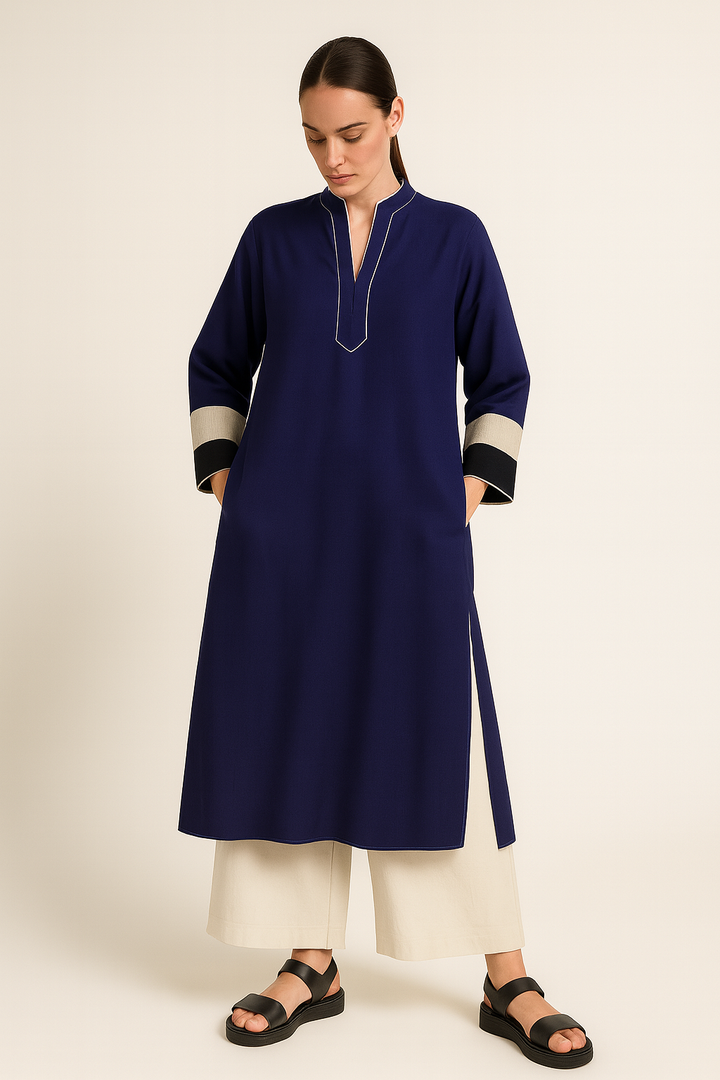 - A band collar V neck shirt with thread detailing around band and front placket and contrasting trim on.