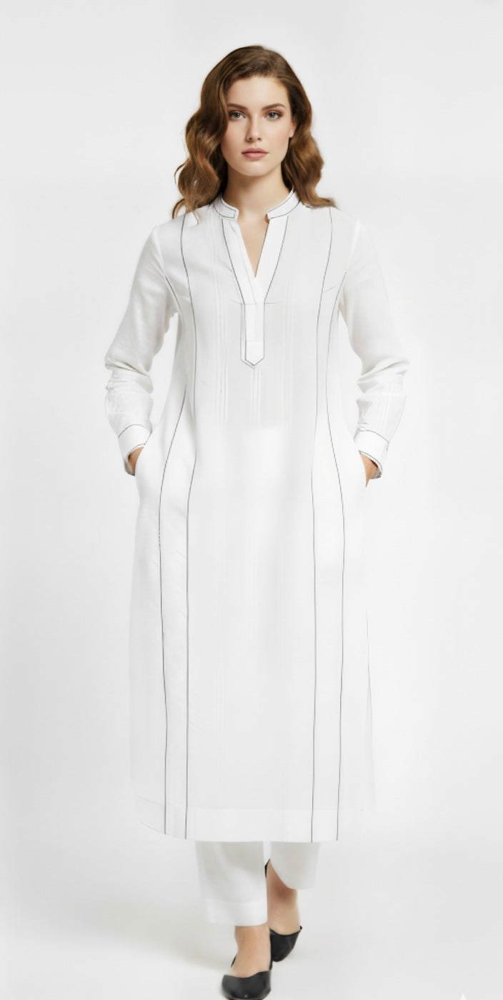 - A V cut band collar shirt with black thread detailing around band and front placket and side panels of shirt paired with straight pants.