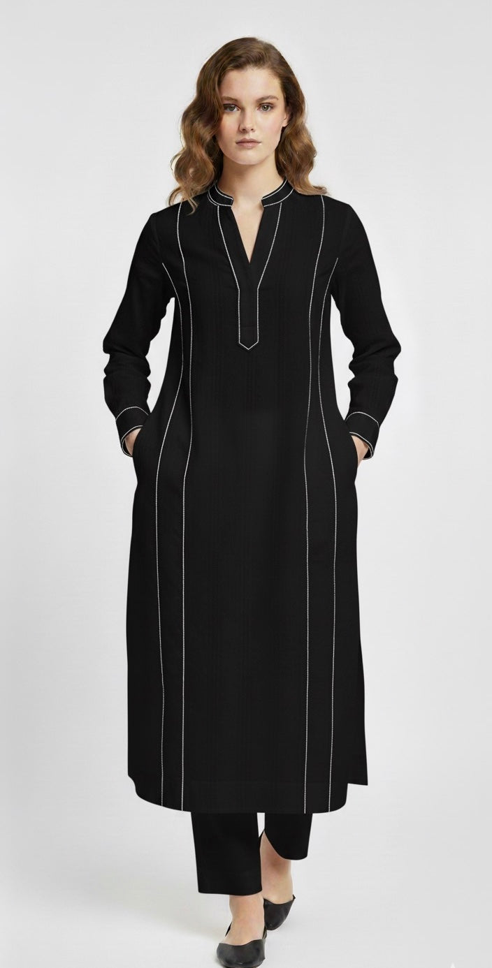 - A V cut band collar shirt with black thread detailing around band and front placket and side panels of shirt paired with straight pants.