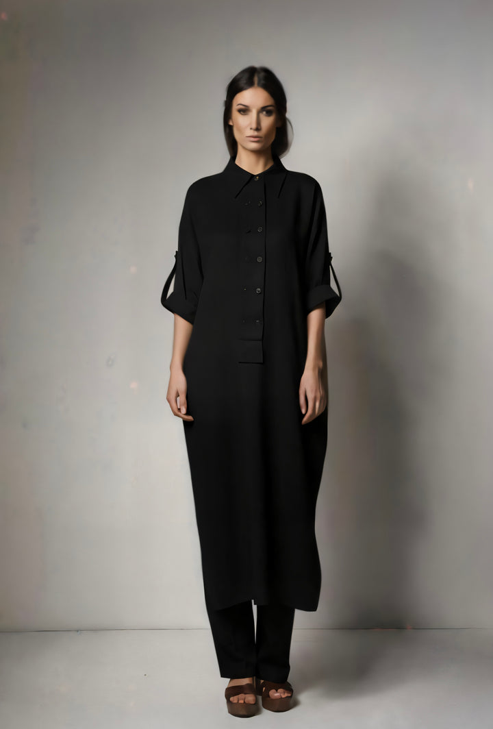 - A collar shirt with front placket and buttons detailing and sleeves gathered up paired with straight pants.