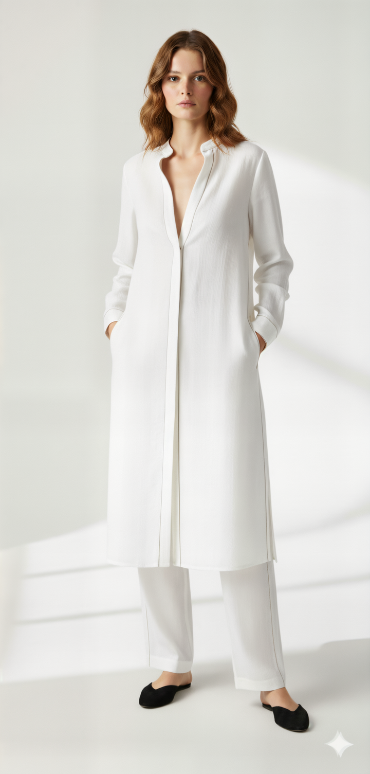 - A V cut band collar shirt with black thread detailing around band and front placket and side panels of shirt with side pockets paired with straight pants.