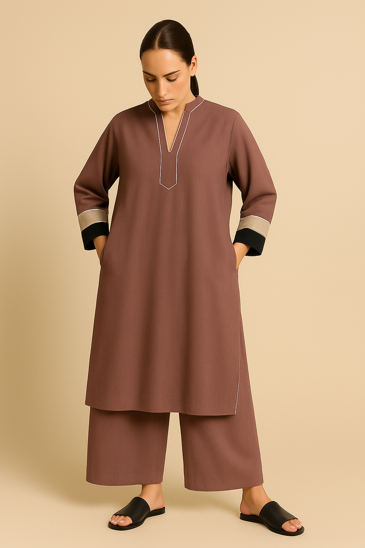 - A band collar V neck shirt with thread detailing around band and front placket and contrasting trim on sleeves paired with loose/relaxed pants.