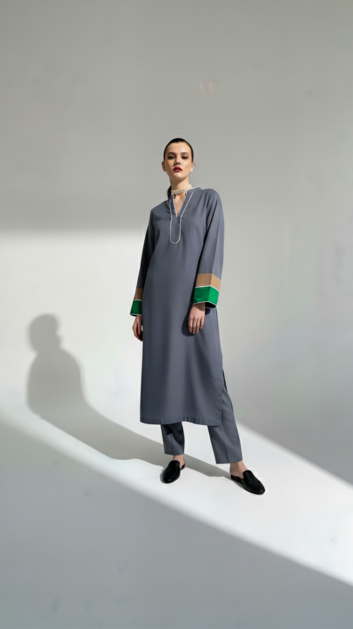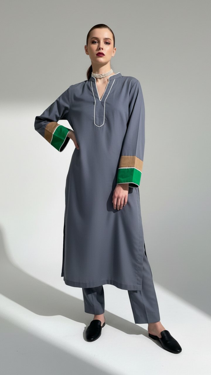 - A band collar V neck shirt with thread detailing around band and front placket and contrasting trim on sleeves paired with loose/relaxed pants.