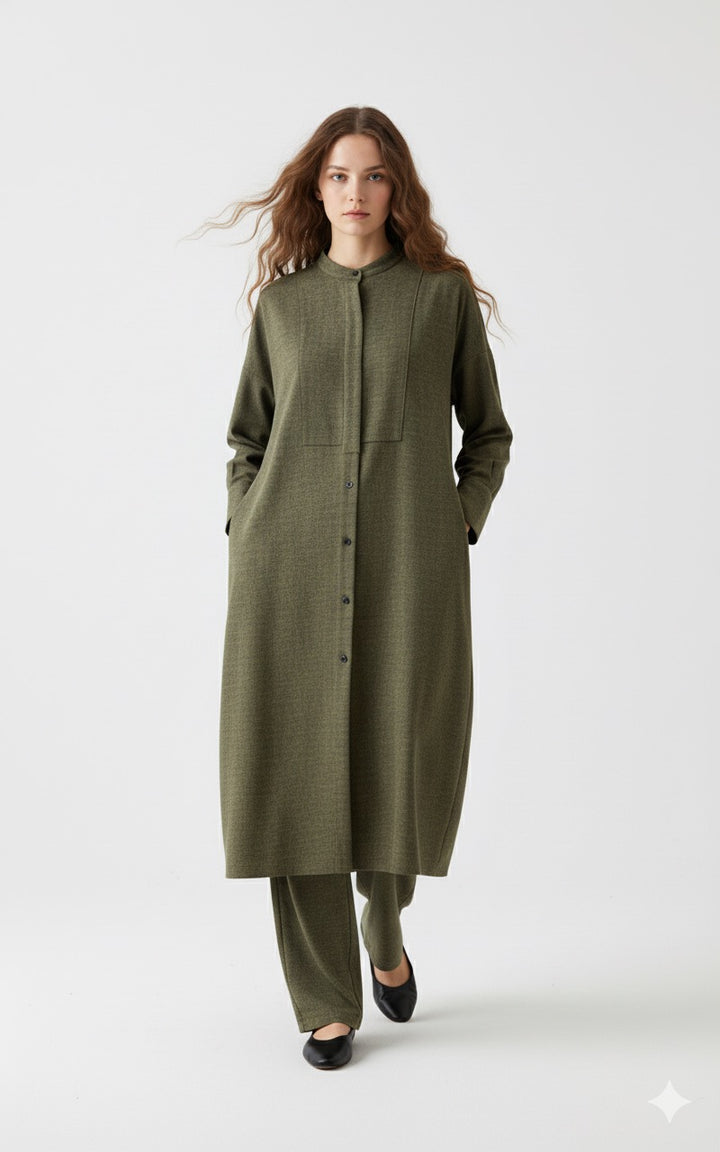 - A band collar button-down shirt with side pockets paired with straight dhalwar.
