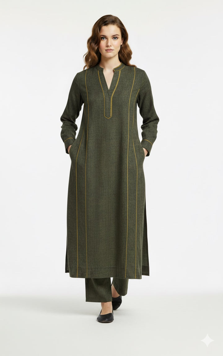 - A V cut band collar shirt with black thread detailing around band and front placket and side panels of shirt paired with straight pants.