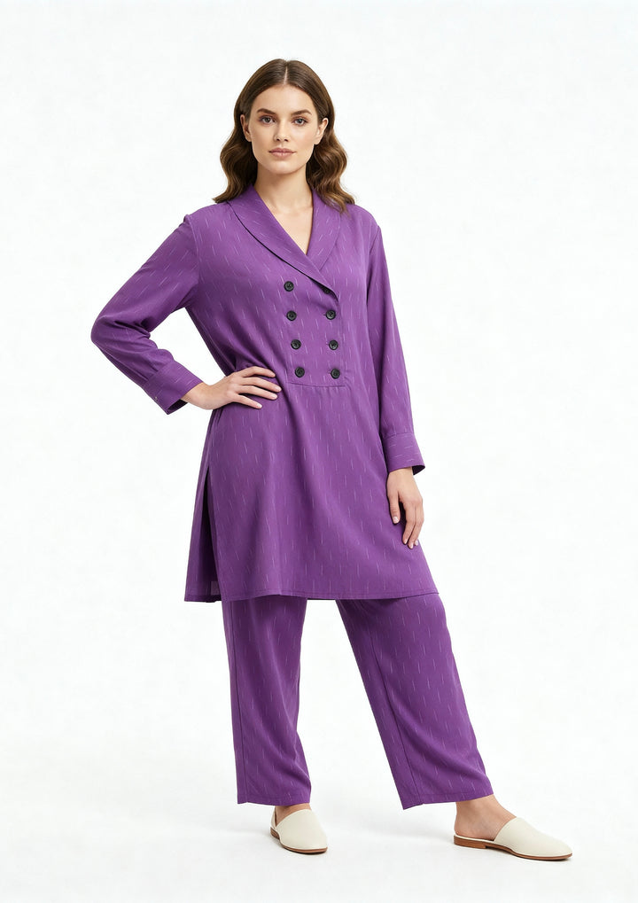 - A coat collar shirt with elegantly placed button detailing on the front paired with straight pants.