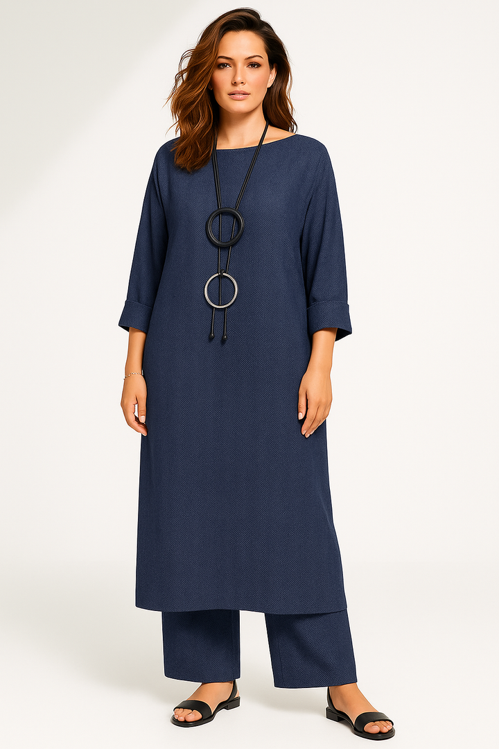 - A boat neck loose fit shirt paired with loose pants.