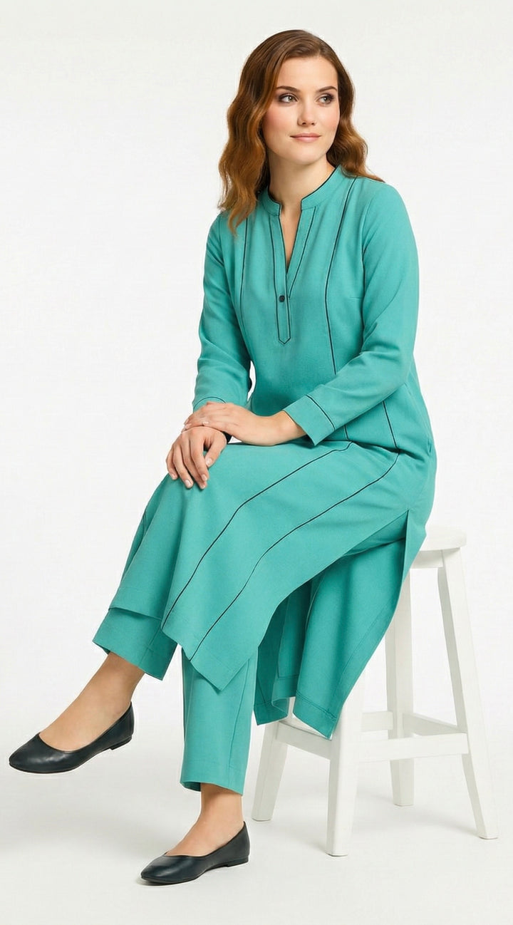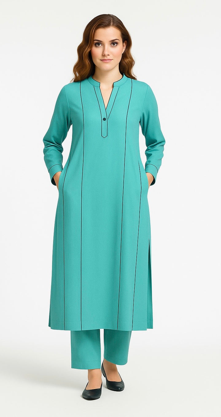 - A V cut band collar shirt with yellow thread detailing around band and front placket and side panels of shirt paired with straight pants.