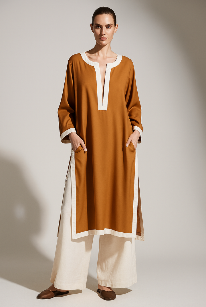 - A round neck V cut shirt with contrasting trim around the neck and hem.